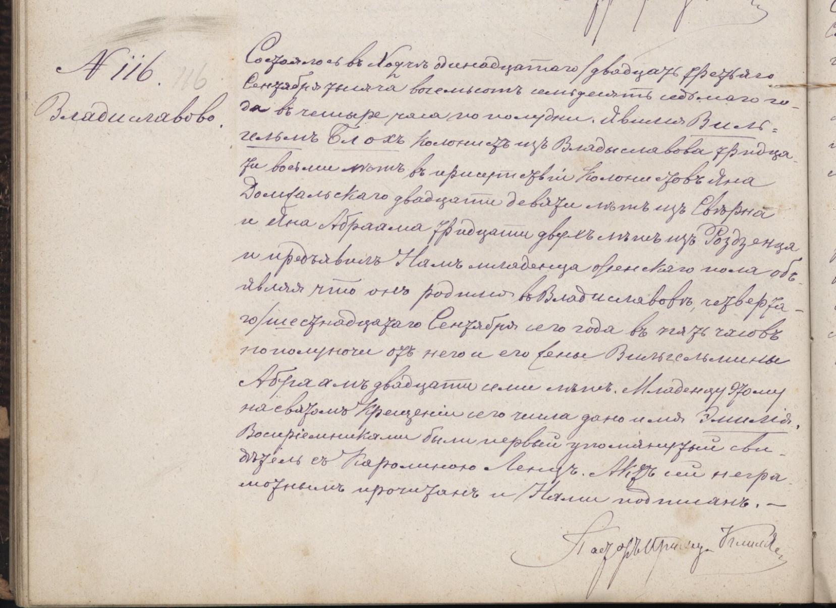 Meldeort/-datum: Chodecz, 11./23. September 1877, 4 Uhr nachmittags Anzeigender: Wilhelm Bloch, Kolonist/Ansiedler aus Wladyslawow, 38 Jahre Zeugen: Kolonist/Ansiedler Jan (Johann) Domsalski(?), 29 Jahre, aus Swerno(?), und Jan (Johann) Abraam, 32 Jahre, aus Rozdzenze(?) Geburtsort/-datum: Wladyslawow, 4./16. September dieses Jahres, 5 Uhr nachmittags Mutter: Wilhelmina geb. Abraam, 27 Jahre Kind: Emilia Paten: der erstgenannte Zeuge und Karolina Lenz