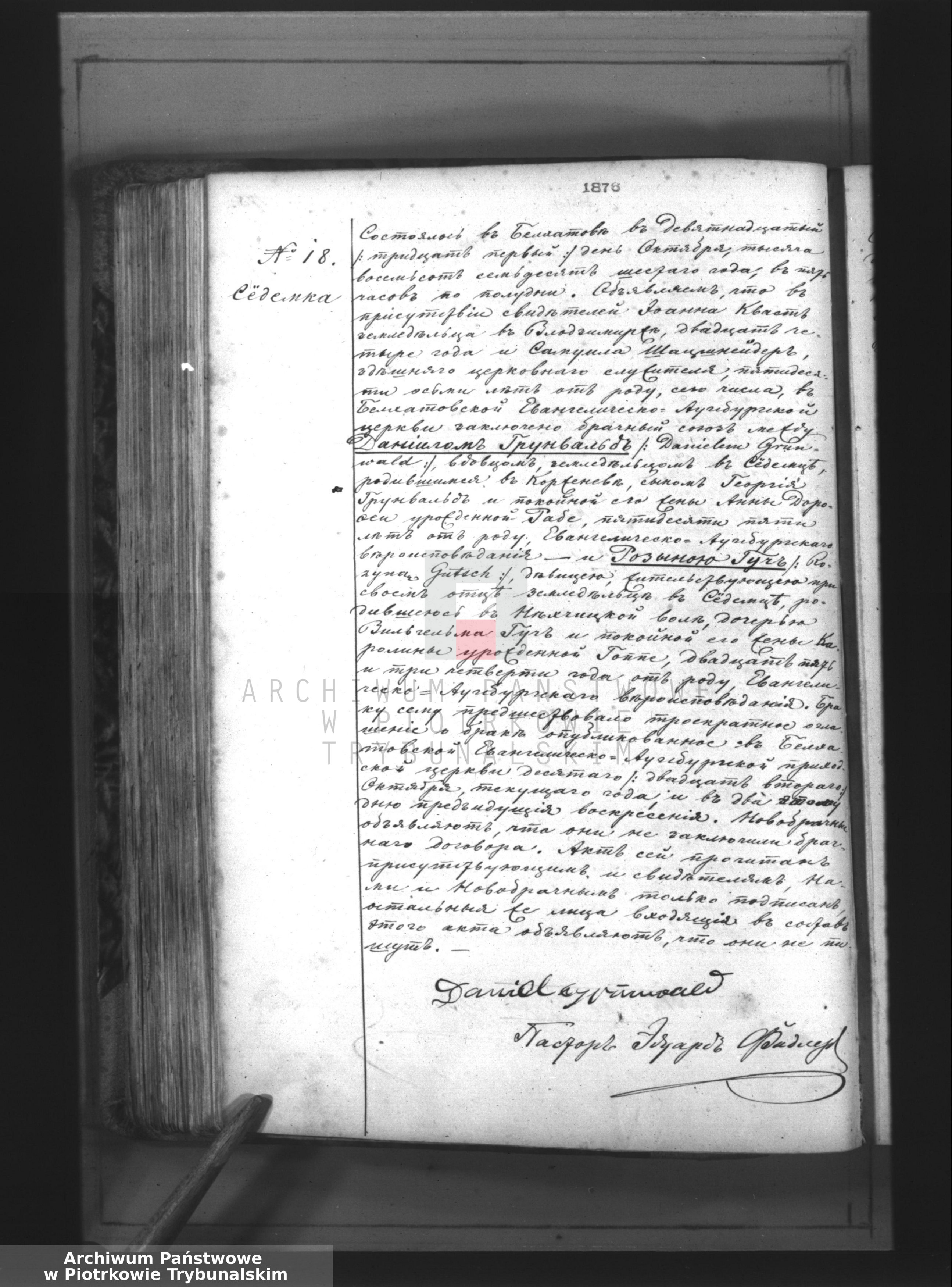 Hiermit wird bescheinigt, dass am 14./27. Mai 1912 und an zwei darauffolgenden Sonntagen in der evangelisch-augsburgischen Kirche von Tomaszów, der Pfarrei des Verlobten, dreimal ein Aufgebot über die Absicht zur Eheschließung zwischen dem Junggesellen Henryk Taron, 23 Jahre alt, evangelisch-augsburgischen Glaubens, einem Arbeiter, geboren in Szymanów, dem Sohn des verstorbenen Arbeiters Jan Taron und seiner Frau Berta, geborene Szechinger, und Fräulein Anna Sztelcer, 24 Jahre alt, evangelisch-augsburgischen Glaubens, in Sabinów wohnhaft bei ihrer dort geborenen Mutter, der Tochter des verstorbenen Bauern, bekanntgegeben wurde. Jan Sztelcer und seine überlebende Ehefrau Justyna, geborene Hartwich. Dieser Eheschließung liegen keine Hindernisse vor. Ich bestätige dies mit meiner Unterschrift und meinem Dienstsiegel.