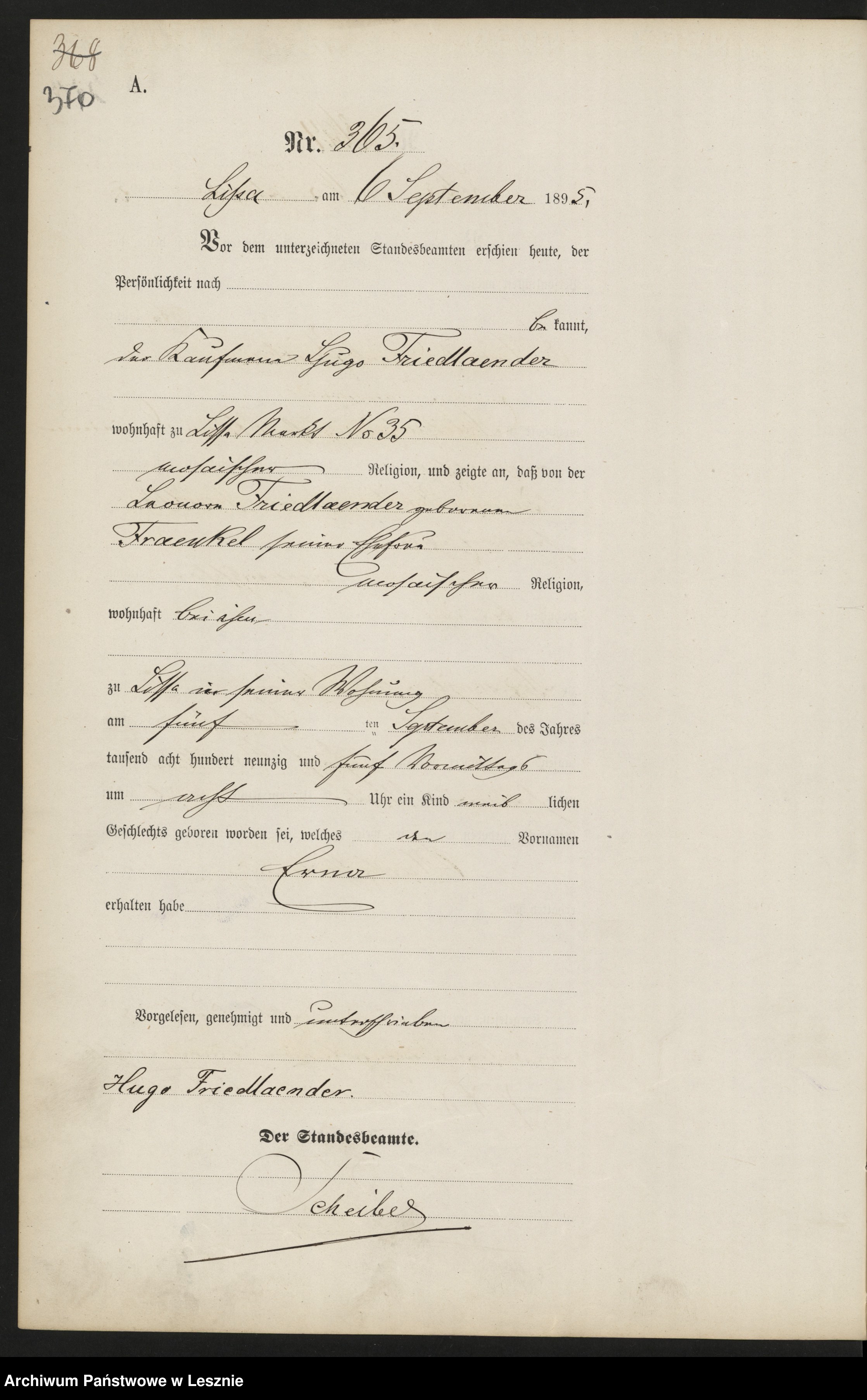 da ich noch nie Urkunden im Raum Posen gesucht habe, bin ich doch recht unerfahren, was die Suche in diesem Gebiet betrifft. Ich habe hier die Heiratsurkunde von Gottfried Johann Maria Haney (08.09.1888 in Skotschau) und Erna Friedländer (05.09.1895 in Lissa) Die Ehe wurde 1921 in Berlin geschlossen. Leider finden sich darin keinerlei Angaben zu den Eltern der Braut Erna Friedländer.