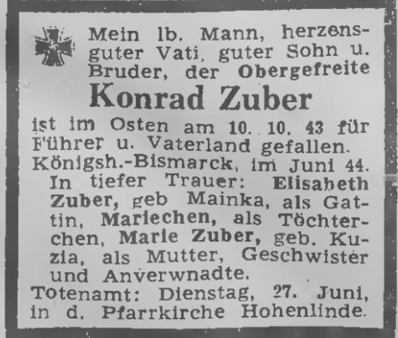 _ Konrad Zuber, *~ vl. 1910-1915, + 10.10.1943 gefallen im "Osten", oo ~1935-1939 wo?, Elisabeth Mainka, + Braunschweig, (verm. Tochter des Fritz Mainka), 1944 lebte Elisabeth wo - Königshütte, Bismarckhütte, Hohenlinde?