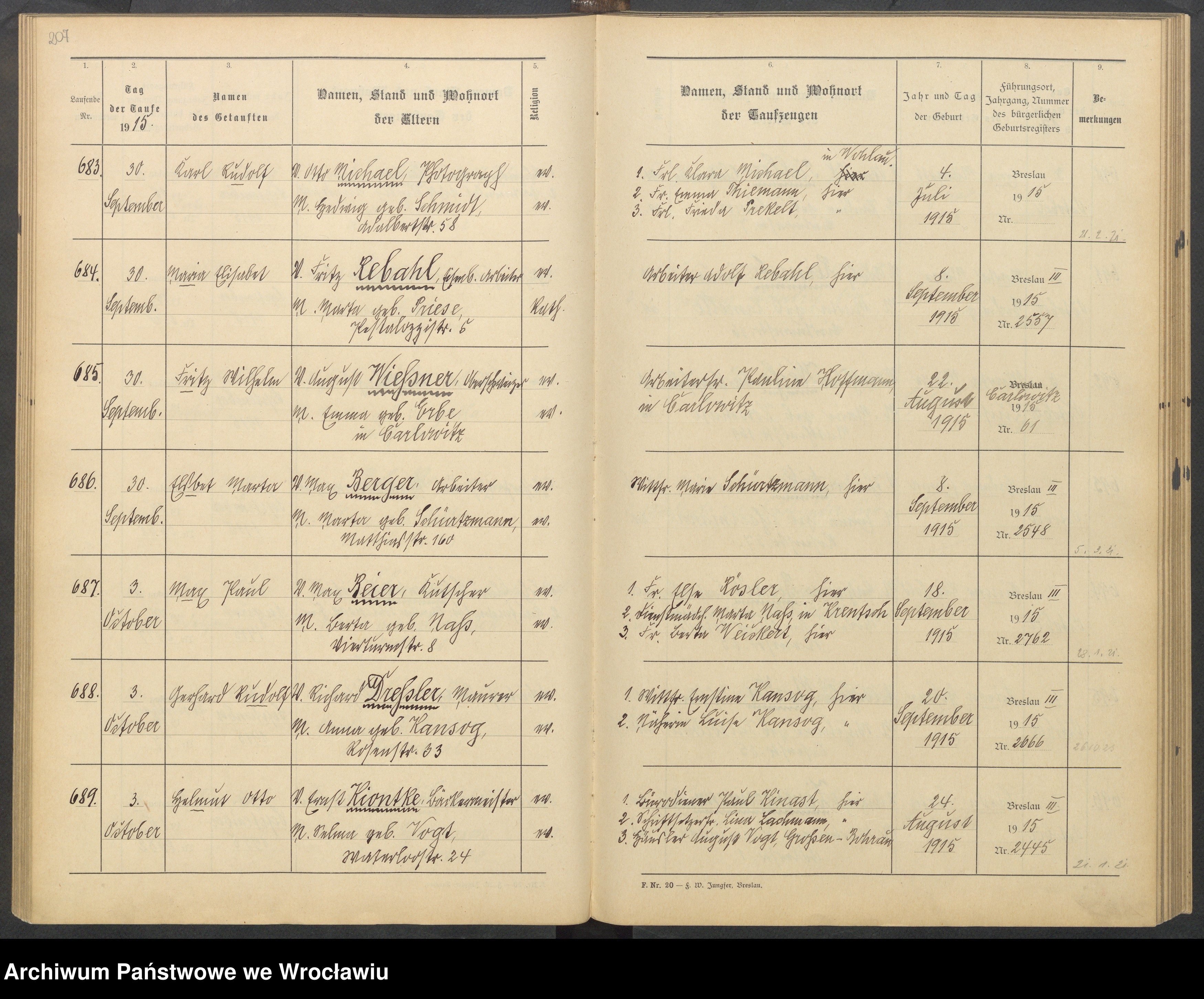 Die Taufe von Fritz Wilhelm war am 30.09.1915 in der evg. Kirche Elftausend Jungfrauen: