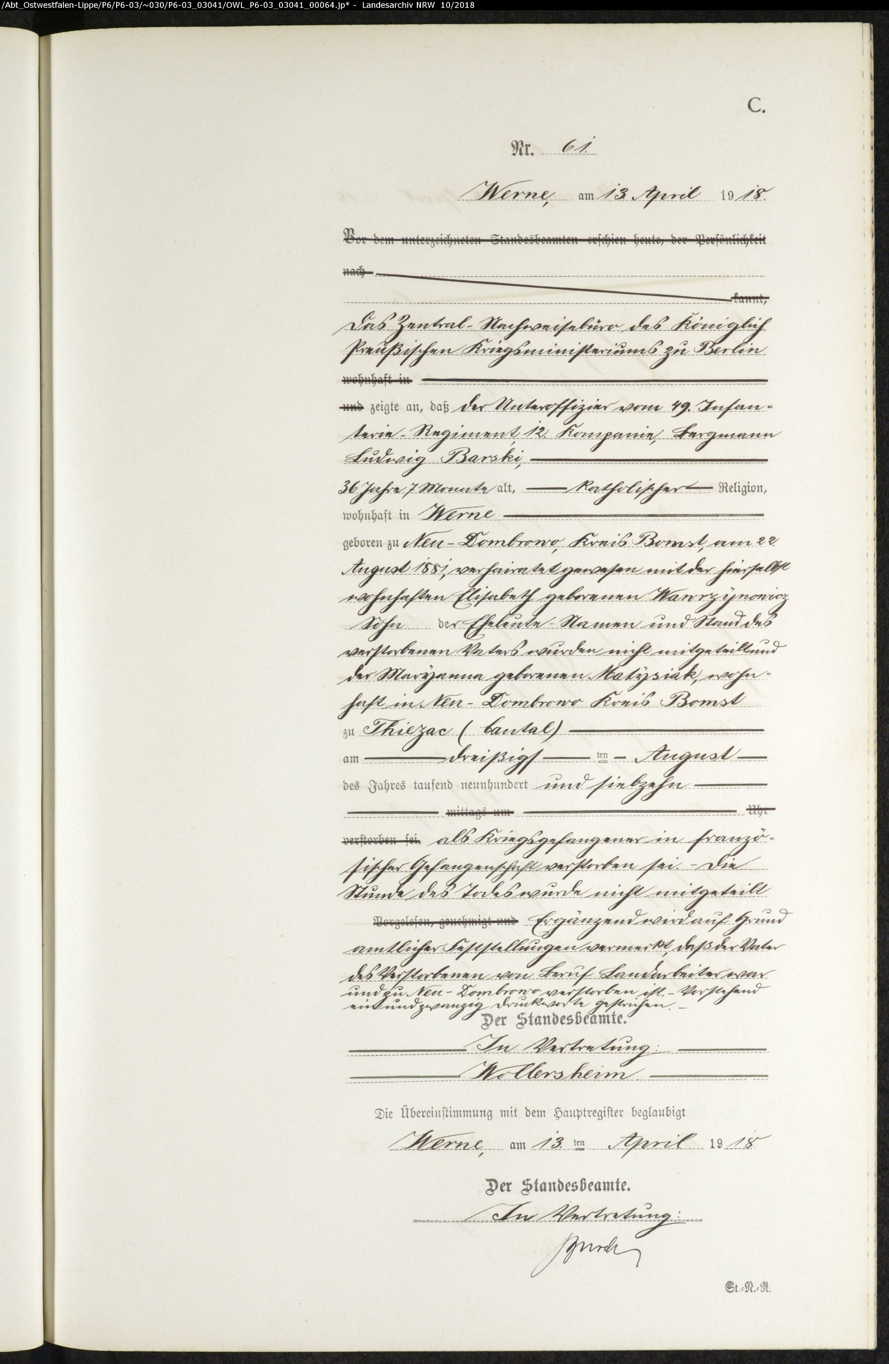 Die Urgroßtante meiner Frau, Wawrzynowicz Elisabeth, wurde am 7.6.1878 in Polen (Pogorzela) geboren. Sie heiratete Ludwig Barski, der am 30.8.1917 in Frankreich starb. Sie lebten einige Jahre in Werne. Elisabeth wäre 1920 gestorben (laut Familysearch). Ich würde gerne seine Sterbeurkunde finden. Wer kann mich bitte beraten ?