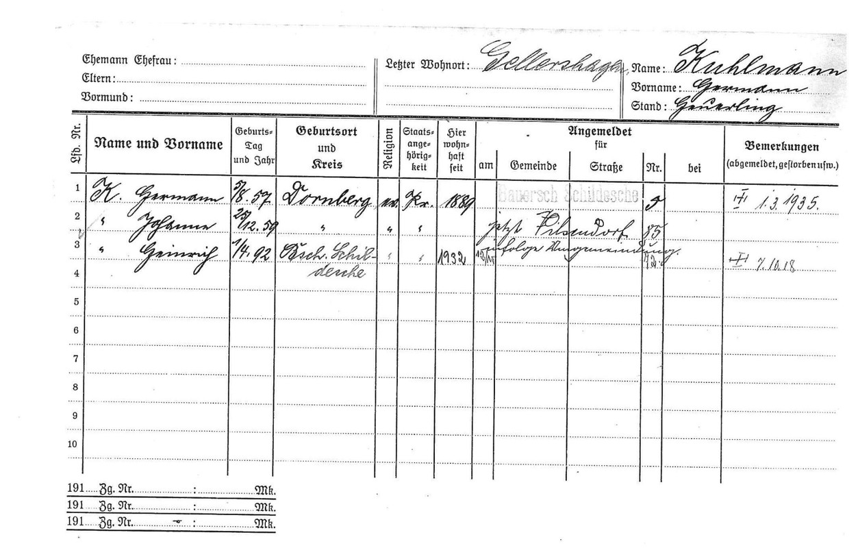 (als weiteres Familienmitglied) Heinrich Kuhlmann geb. 01.04.1892 BS Schildesche, jetzt Vilsendorf infolge Eingemeindung, hier wohnhaft seit 12.10.1932, gest. am 07.10.1918