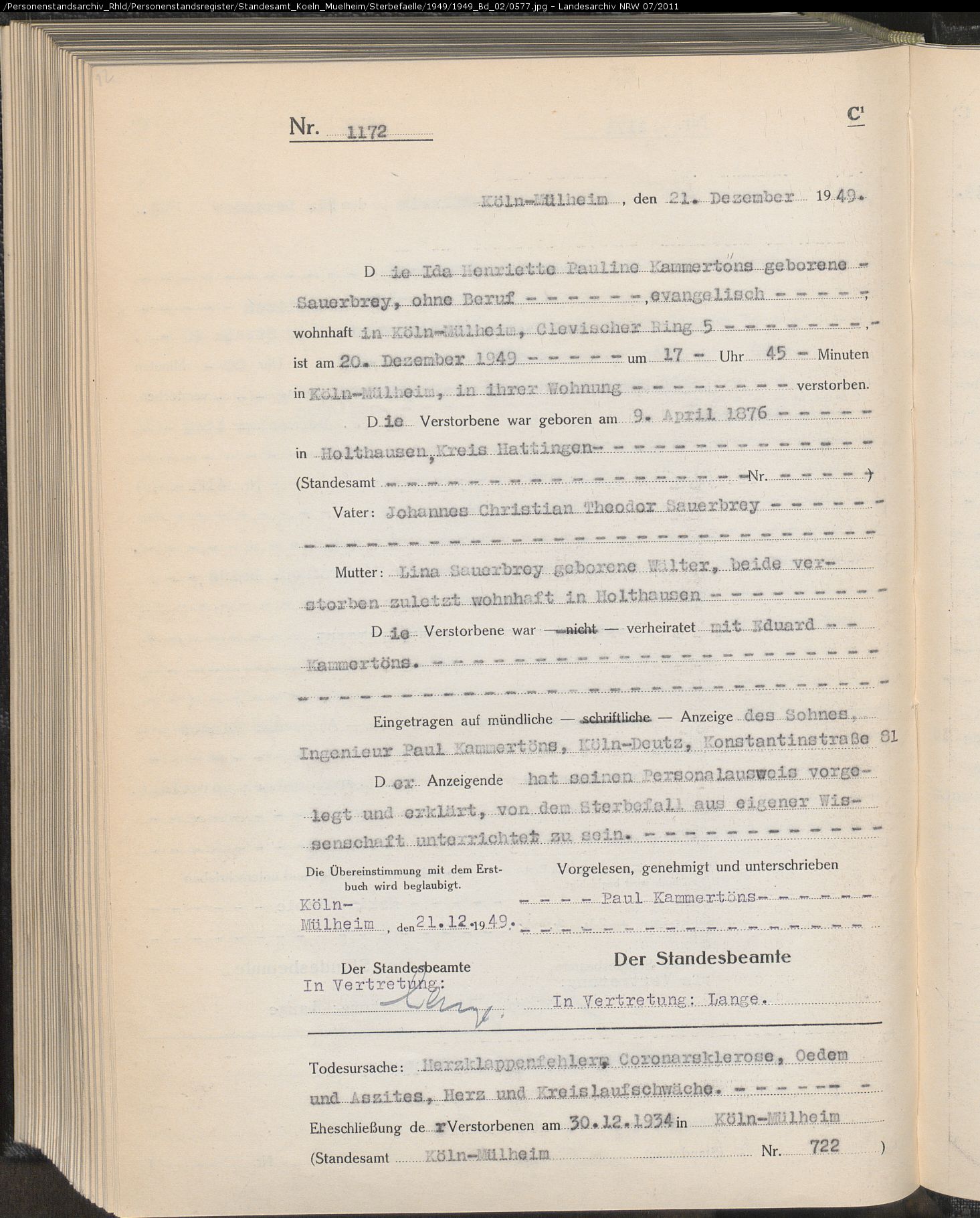 auf der Heiratsurkunde steht: 20. Dezember 1949, aber es geht um seine Frau Pauline.