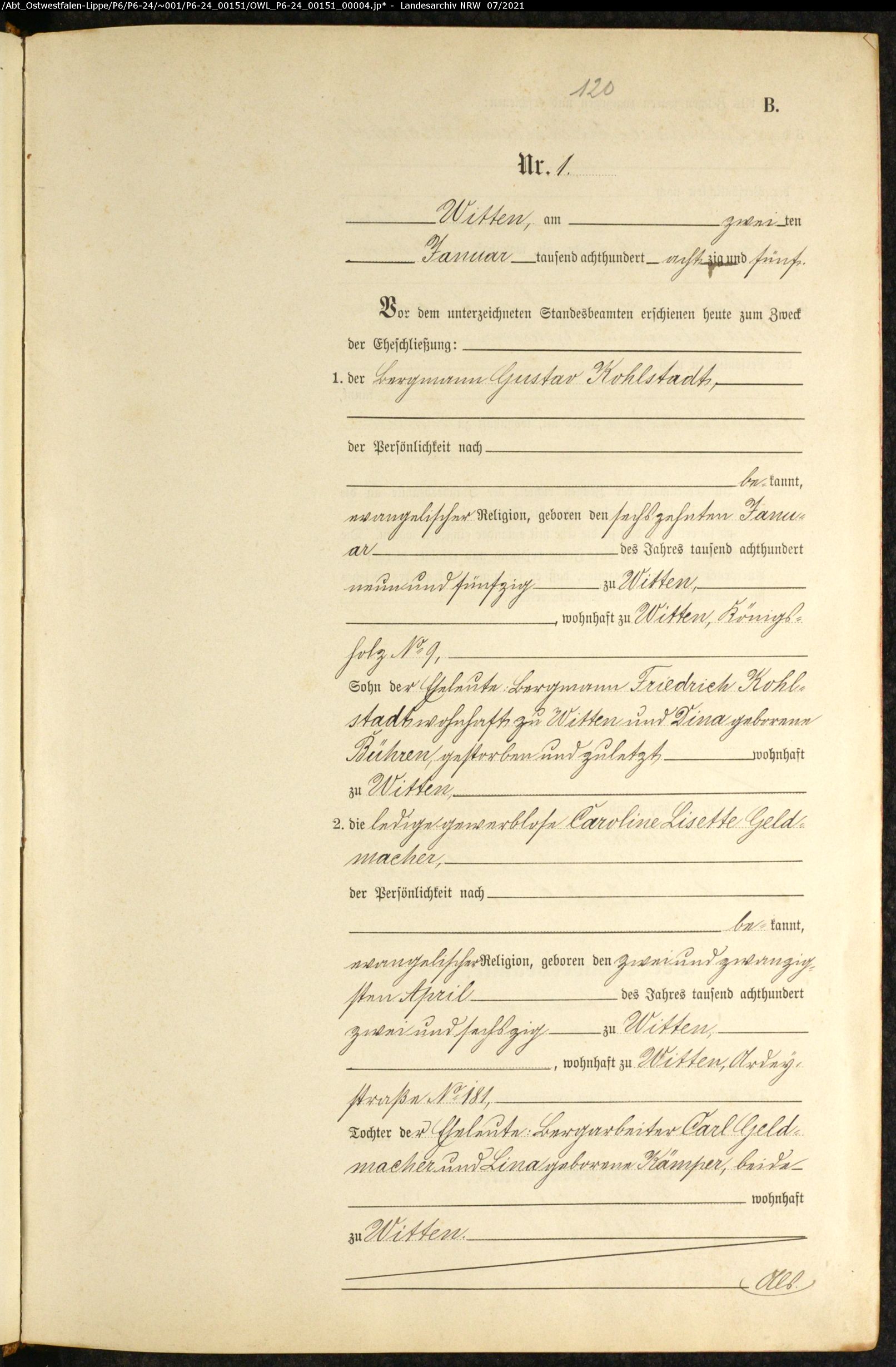 Bergmann Gustav Kohlstadt (*16.01.1859 in Witten), wohnhaft Königsholz No. 9, Sohn der Eheleute Bergmann Friedrich Kohlstadt und Dina Büren & ledige gewerblose Caroline Lisette Geldmacher (*22.04.1862 in Witten), wohnhaft Ardeystraße No. 181, Tochter der Eheleute Bergarbeiter Carl Geldmacher und Lina Kämper.