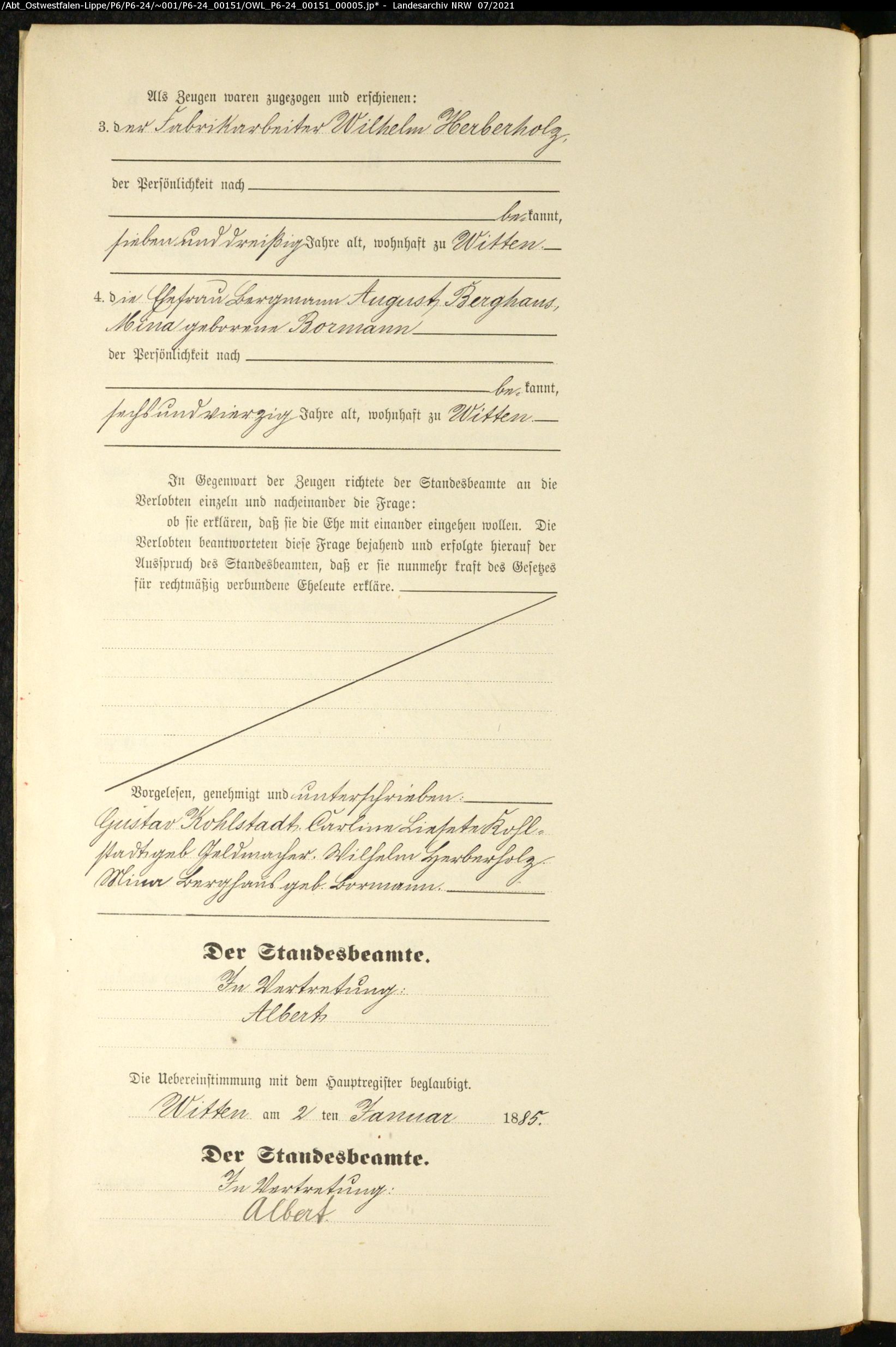 die mutmaßlichen Eltern des angefragten Gustav Kohlstadt (*13.-18.10.1890 in Witten) wurden am °°02.01.1885 in Witten getraut. [Witten B 1885 / Nr. 1]