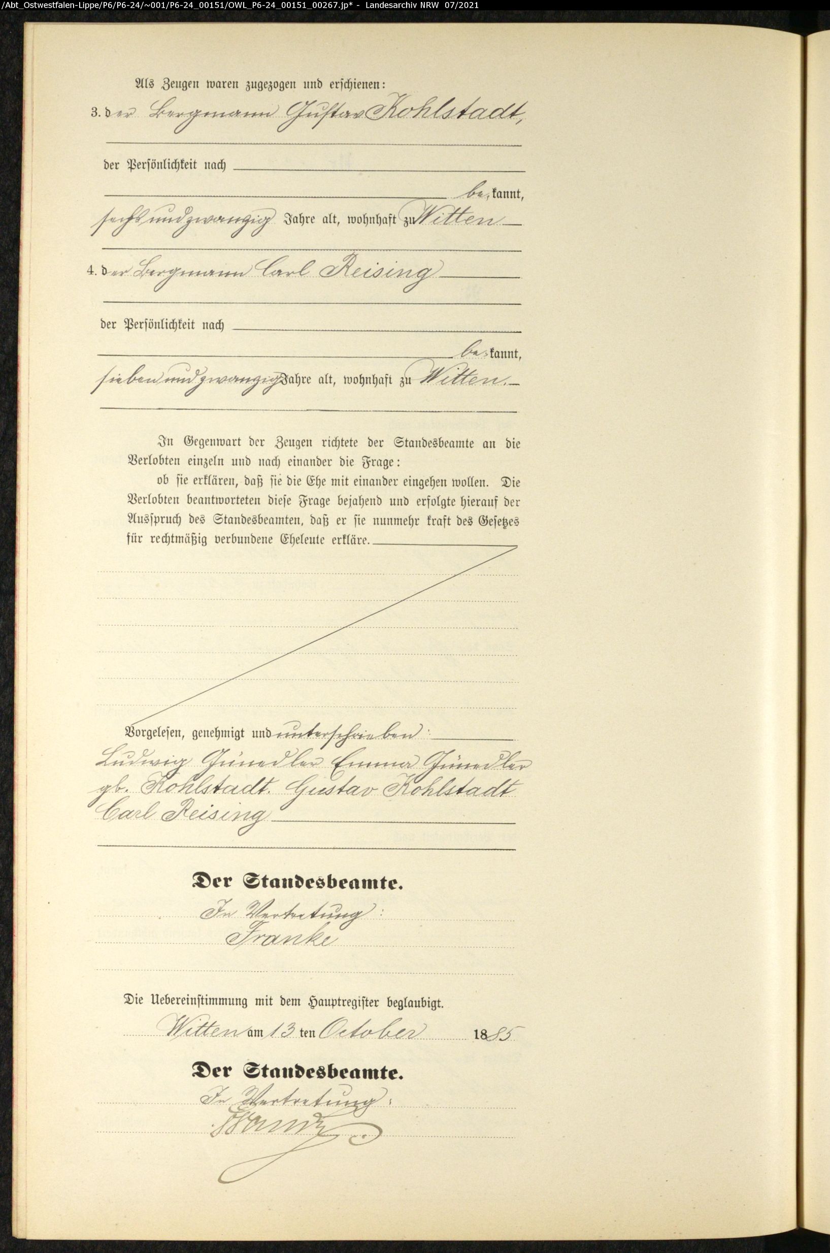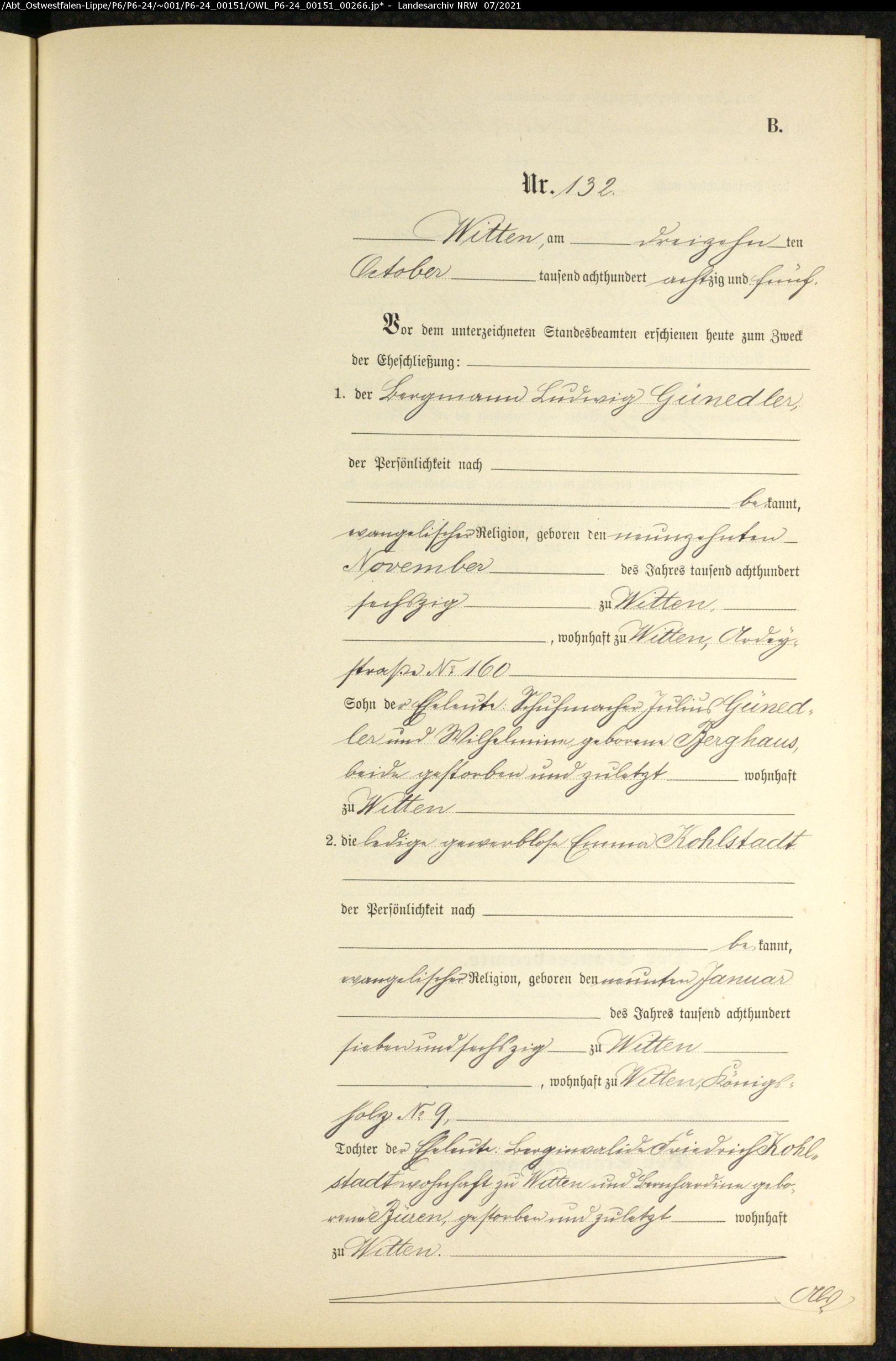 Bergmann Ludwig Günedler (*19.11.1860 in Witten), wohnhaft Ardeystraße No. 160, Sohn der Eheleute Schuhmacher Julius Günedler und Wilhelmine Berghaus, beide gestorben und zuletzt wohnhaft zu Witten & ledige gewerblose Emma Kohlstadt (*09.01.1867 in Witten), wohnhaft Königsholz No. 9, Tochter der Eheleute Berginvalide Friedrich Kohlstadt, wohnhaft zu Witten und Bernardine Büren, gestorben und zuletzt wohnhaft zu Witten.