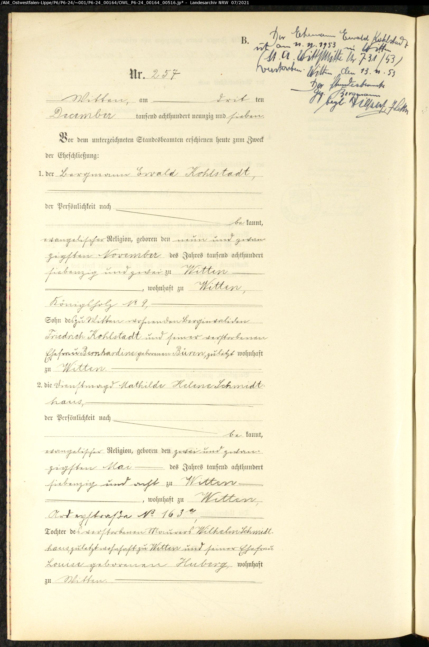 Bergmann Ewald Kohlstadt (*29.11.1872 in Witten), wohnhaft Königsholz No. 9, Sohn des zu Witten wohnenden Berginvaliden Friedrich Kohlstadt und seiner verstorbenen Ehefrau Bernardine Büren & Dienstmagd Mathilde Helene Schmidthaus (*22.05.1878 in Witten), wohnhaft Ardeystraße No. 163a, Tochter des verstorbenen Maurers Wilhelm Schmidtman und seiner zu Witten wohnhaften Ehefrau Luise Huberg.