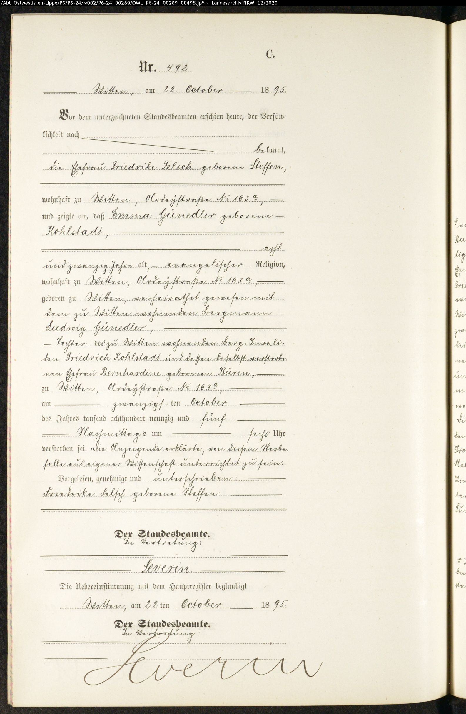 Emma Gündeler, geb. Kohlstadt starb am +20.10.1895 [Witten C 1895 / Nr. 492]