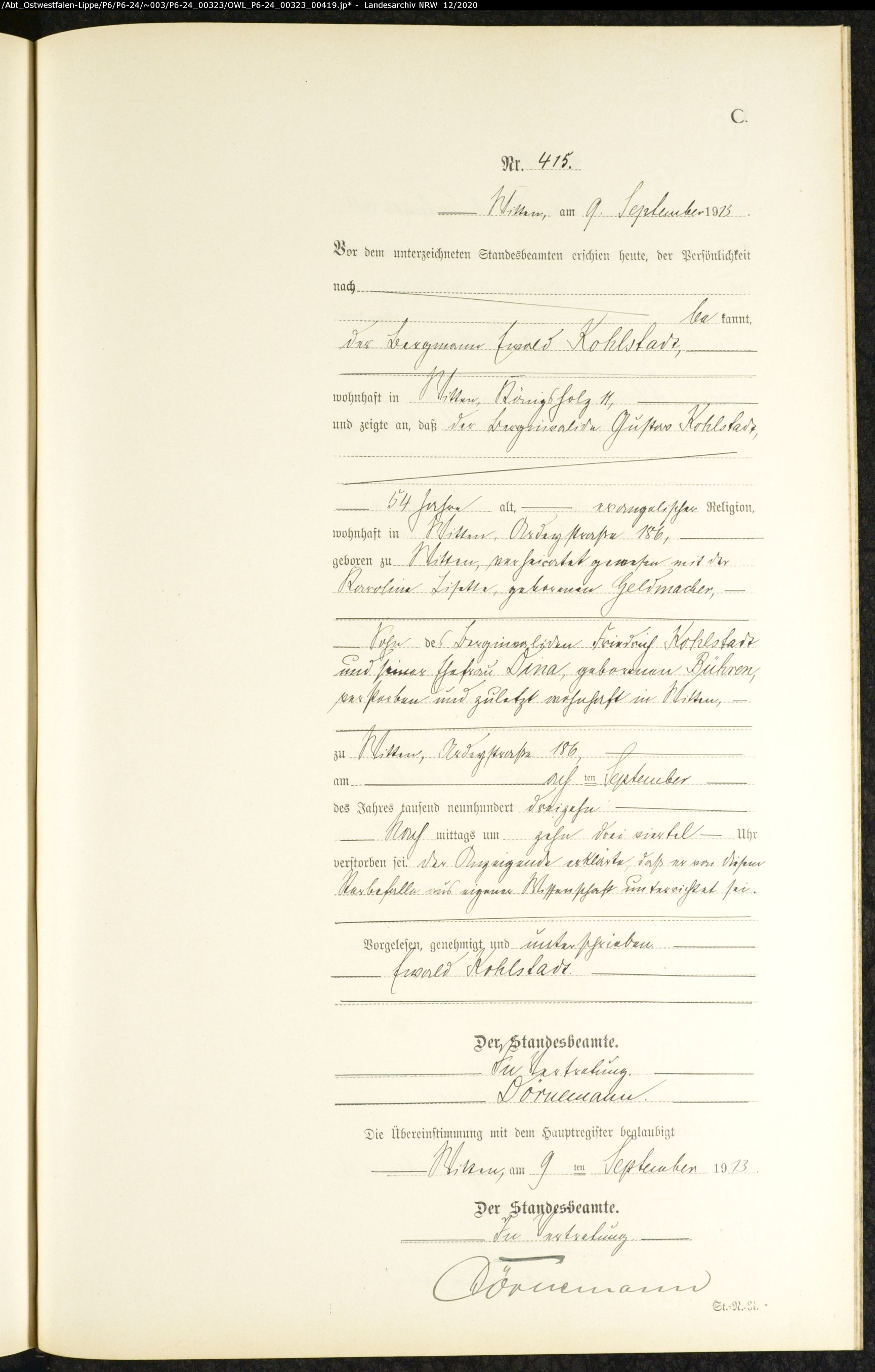 Der Berginvalide Gustav Kohlstadt, wohnhaft Ardeystraße 186, starb im Alter von 54 am +08.09.1913 in Witten. Er war verheiratet mit Karoline Lisette Geldmacher und Sohn der verstorbenen Eheleute Berginvalide Friedrich Kohlstadt und Dina Bühren. Sein Tod wurde angezeigt durch den Bergmann Ewald Kohlstadt, wohnhaft Königsholz 11. [Witten C 1913 / Nr. 415]