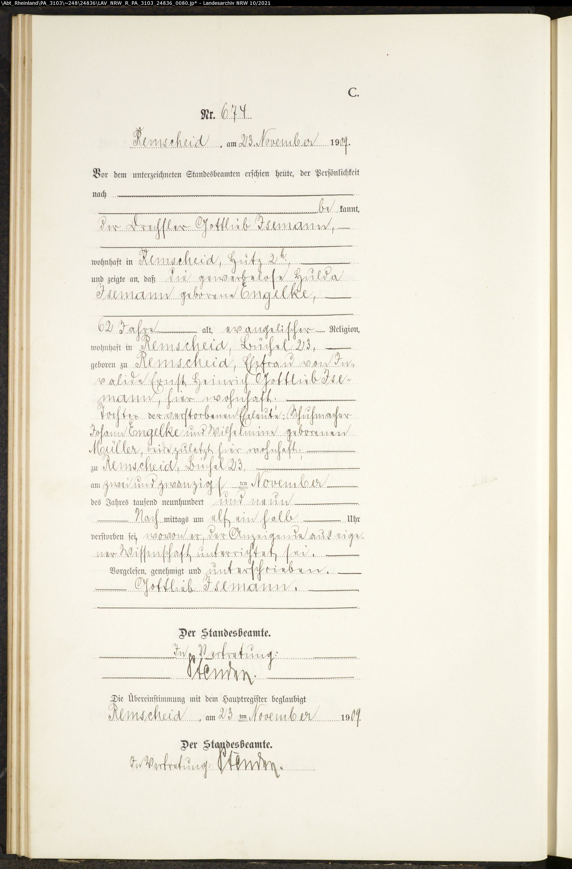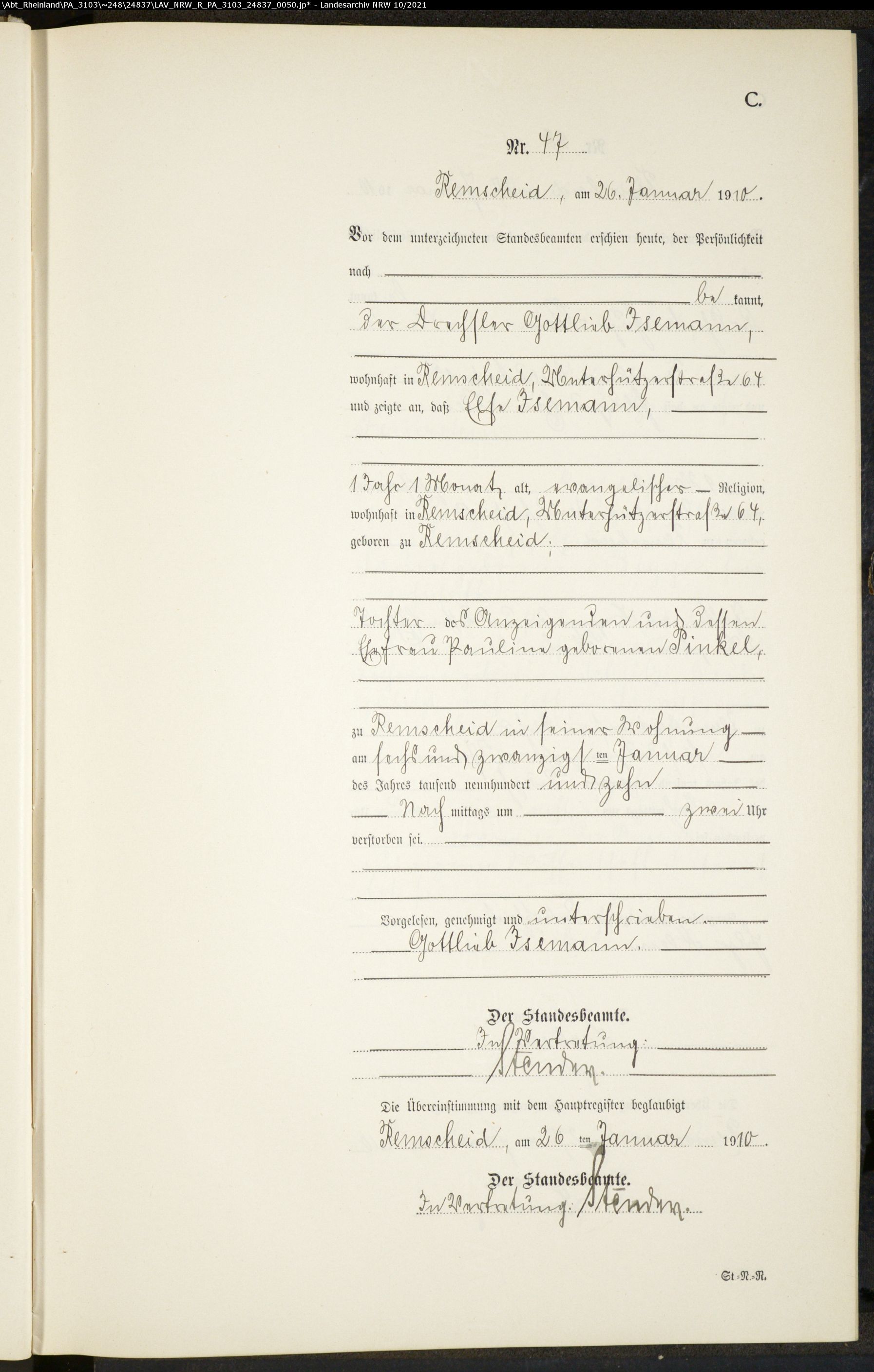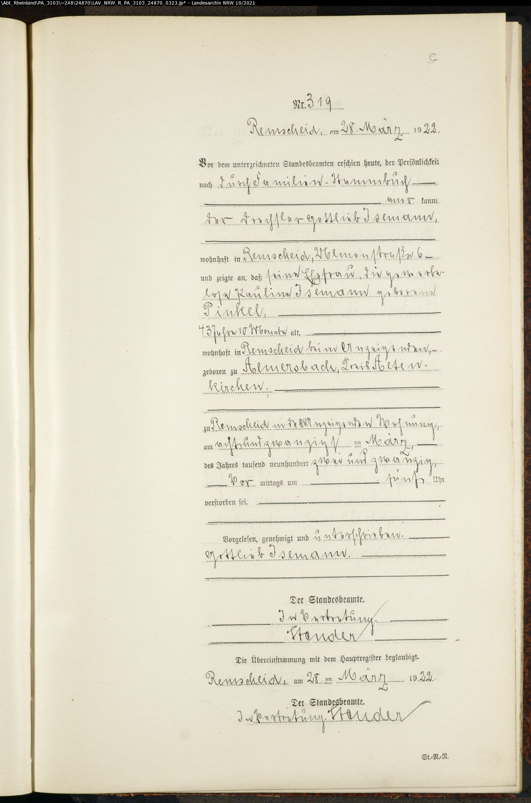 PINKEL, Paulina (W) * 24.05.1878 Almersbach (57610), + 28.03.1922 Remscheid, Dienstmagd, evangelisch, 43 J. 10 M. Haus Nr. 7 (Miete)