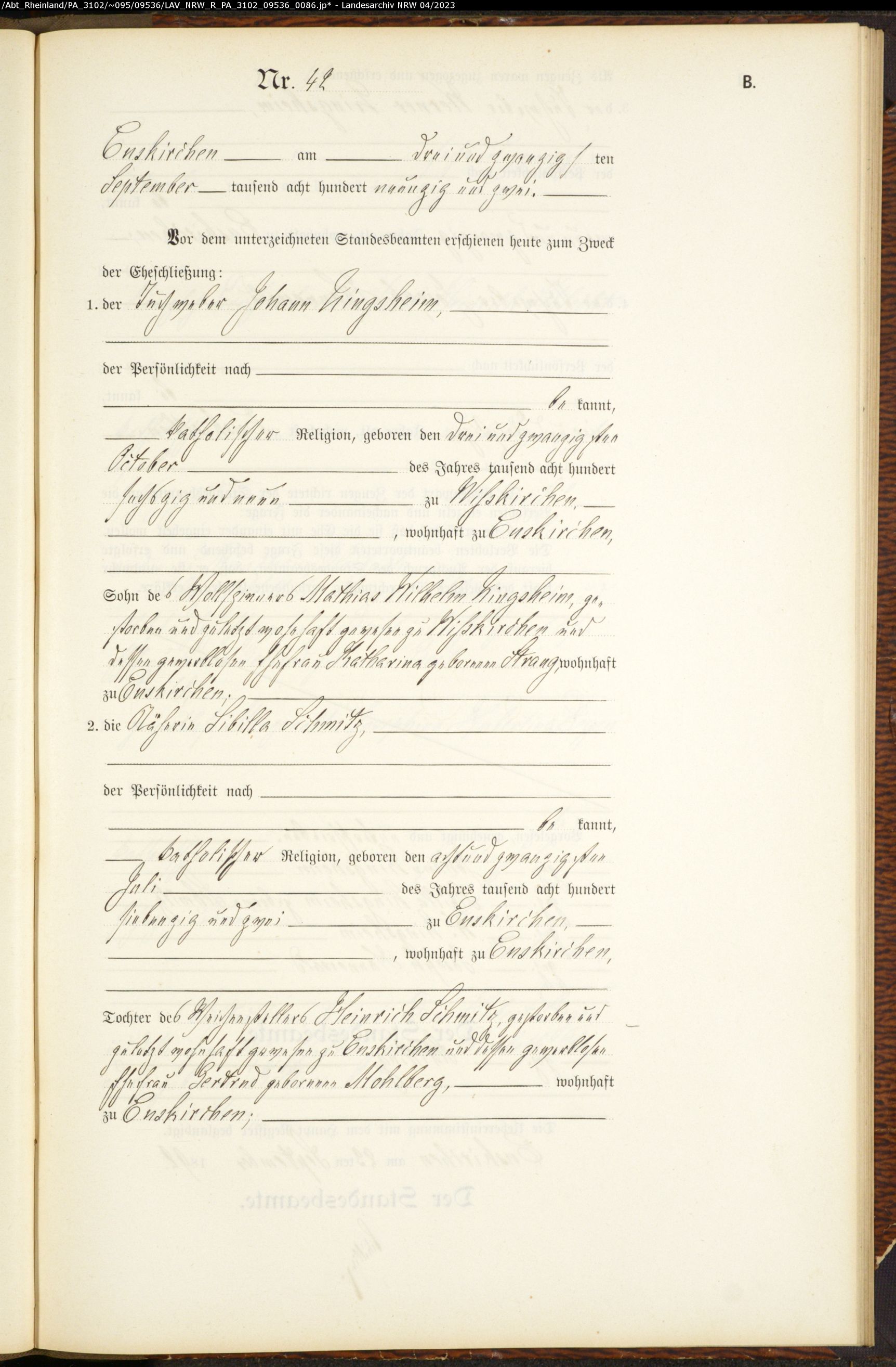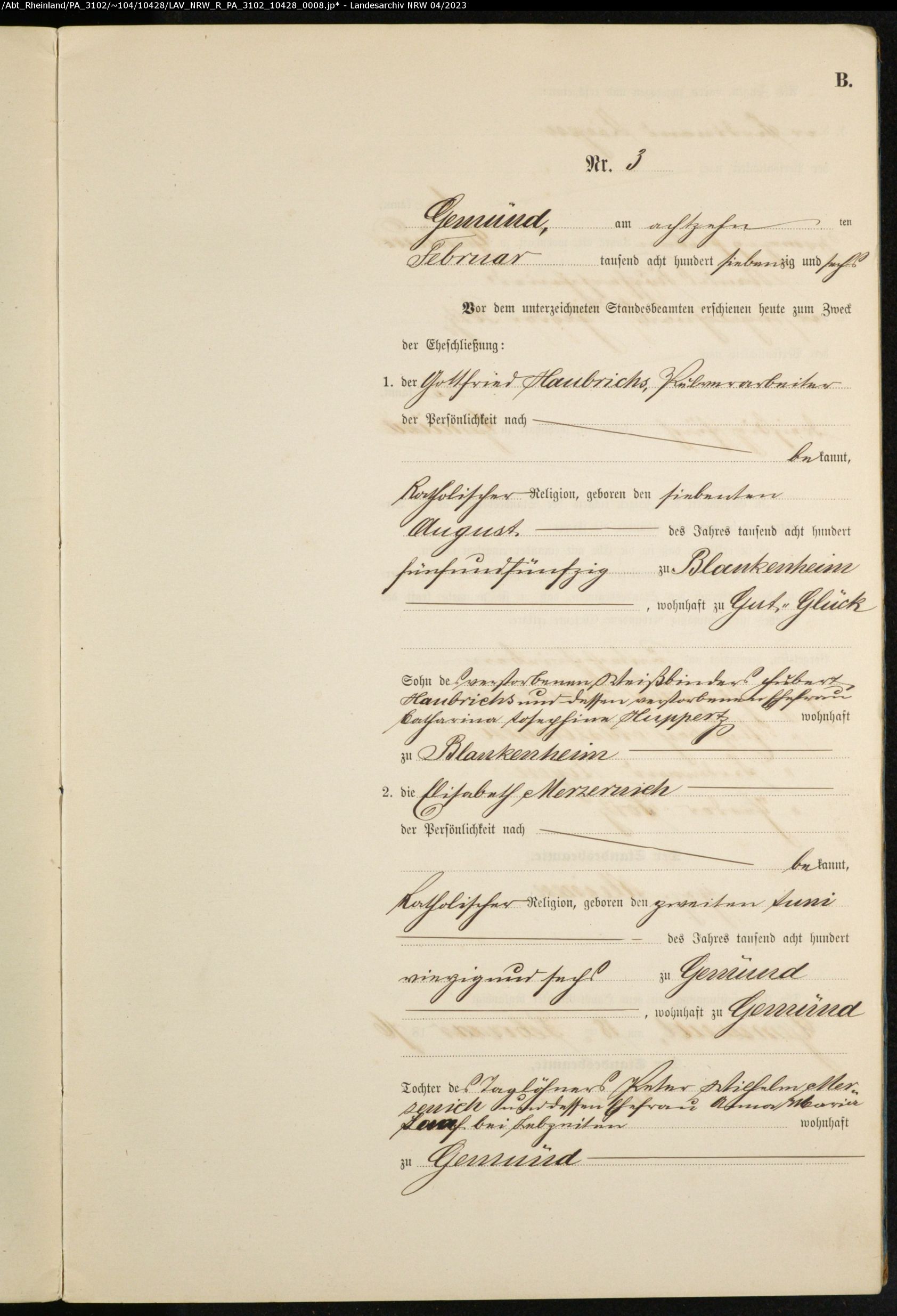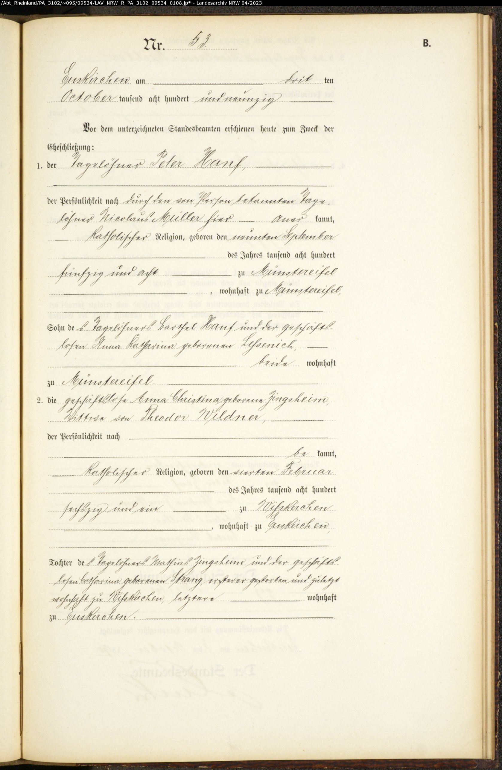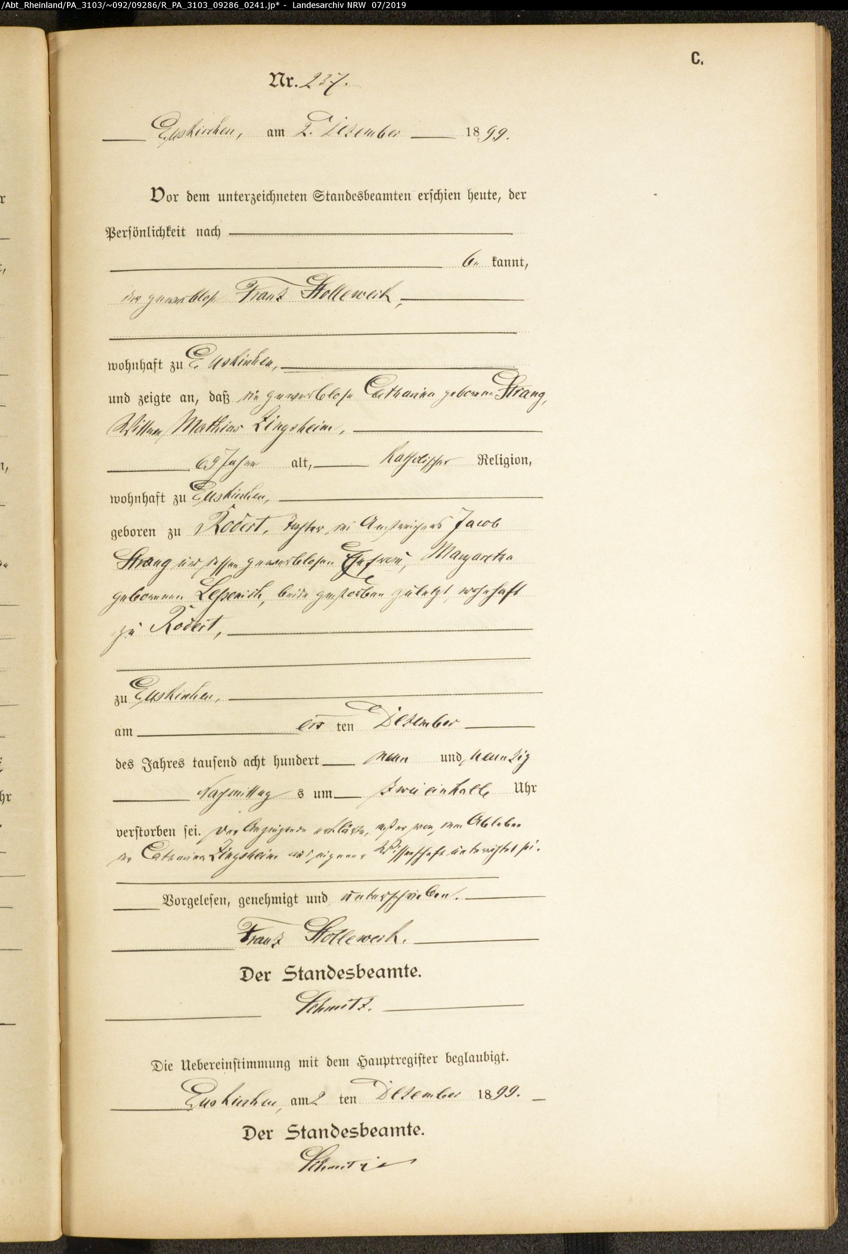 Welche Konfession sie haben weiss ich nicht. Ich vermute römisch katholisch. Eller ist der Geburtsname meiner Großmutter 1915. Ihre Mutter hatte in erster Ehe einen Johann Zingsheim geheiratet, der 1869 in Wisskirchen geboren ist und dann einen Christian Eller, der 1871 in Kuchenheim geboren ist.