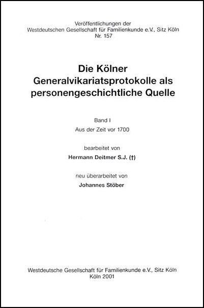 Die Kölner Generalvikariatsprotokolle als personengeschichtliche Quelle. Bd. 1: Aus der Zeit vor 1700. Bearb. von Hermann Deitmer S. J. (+), neu überarb. von Johannes Stöber, Köln 2001 (Veröffentlichungen der Westdeutschen Gesellschaft für Familienkunde 157).
