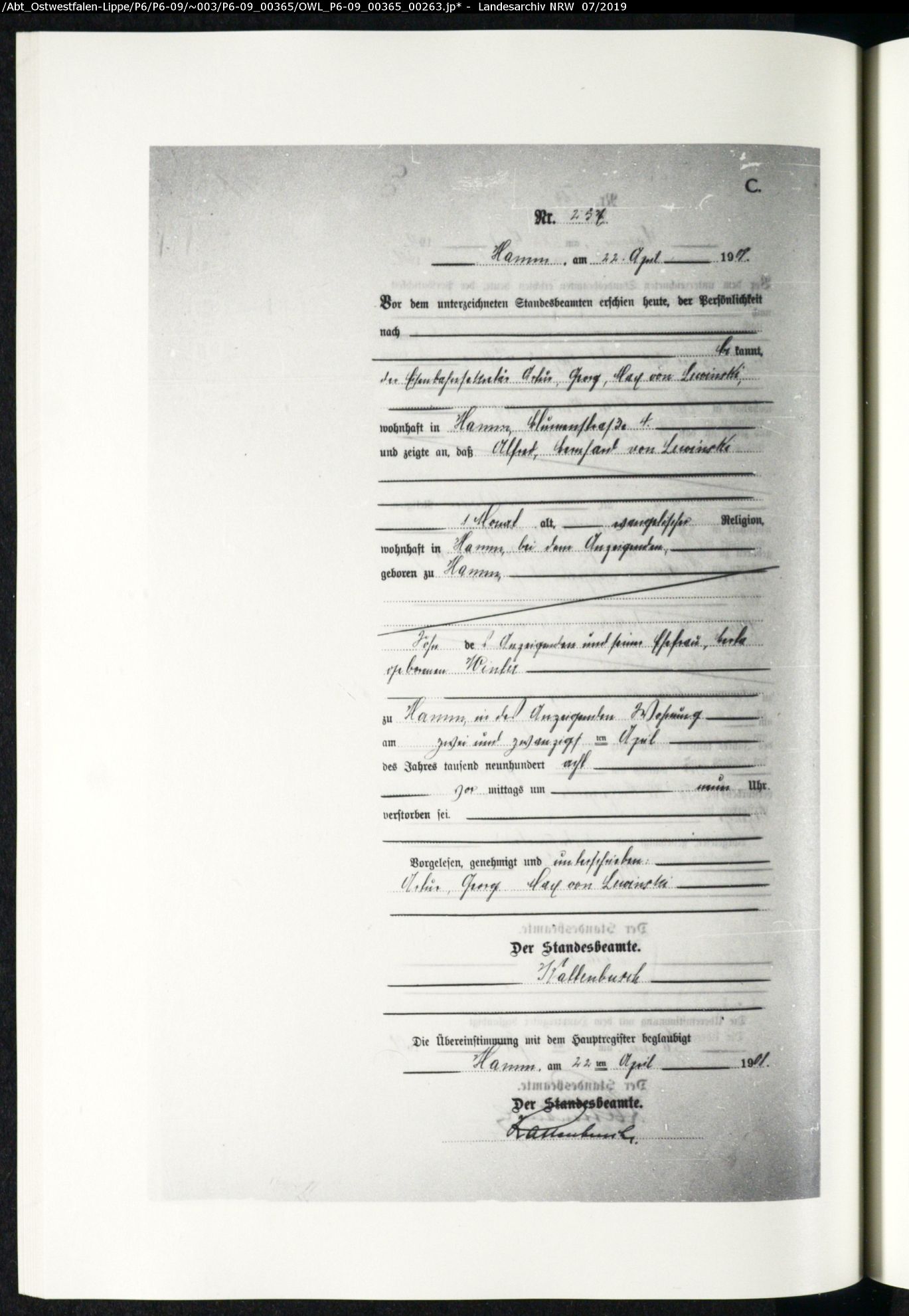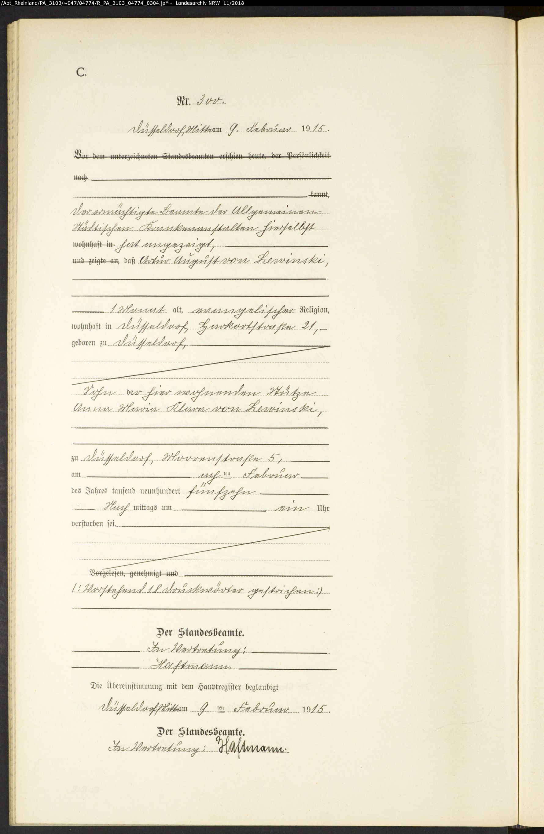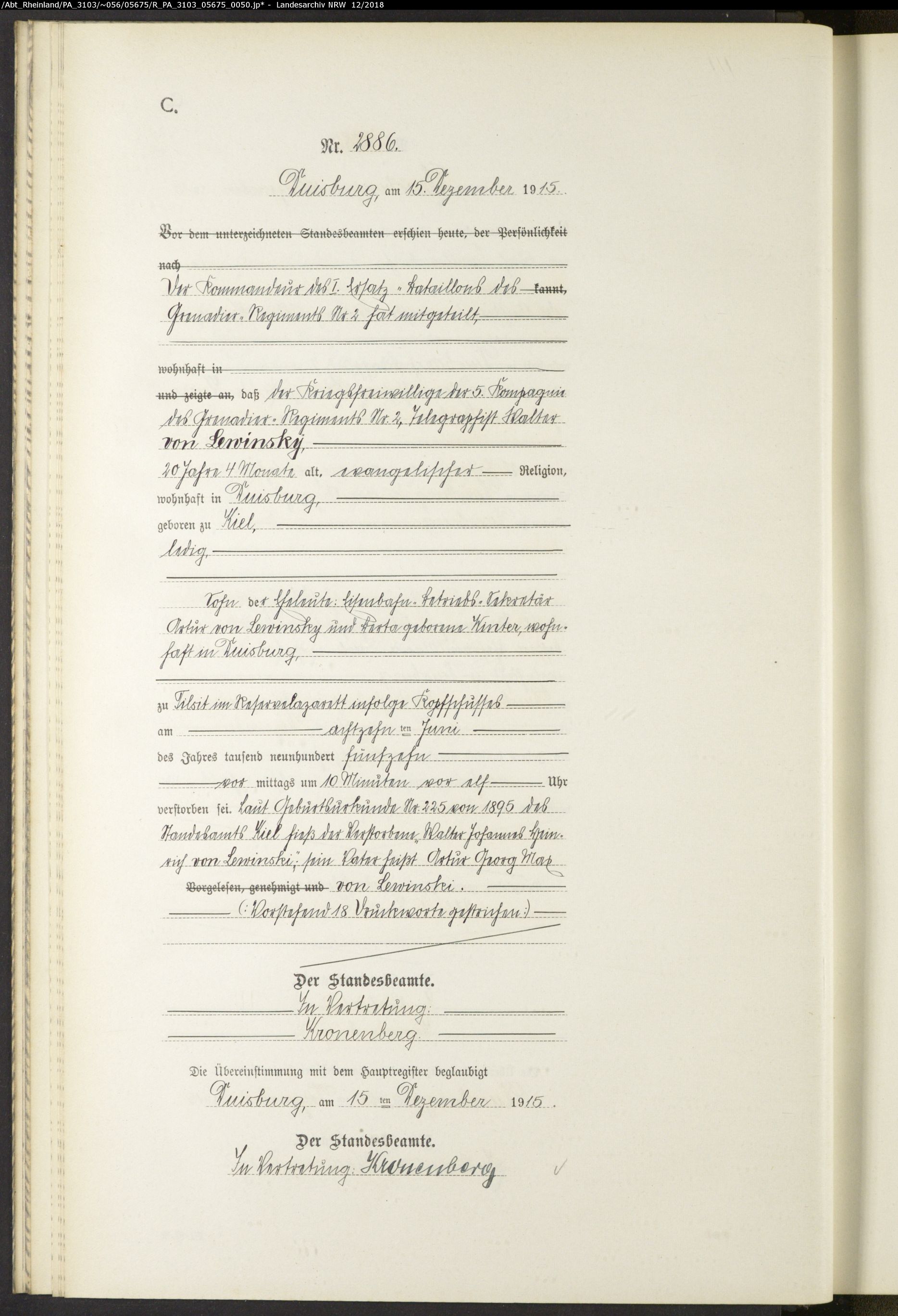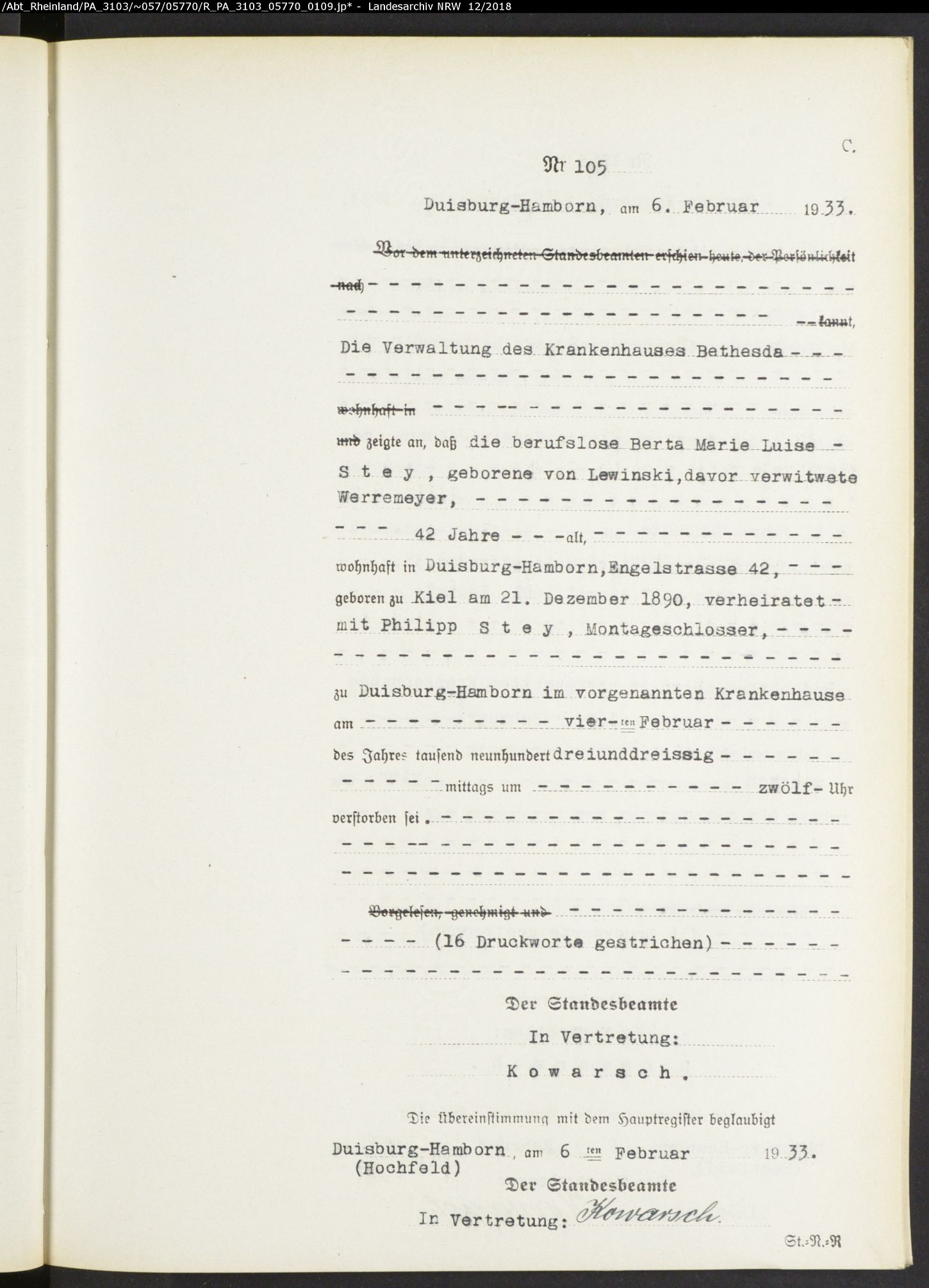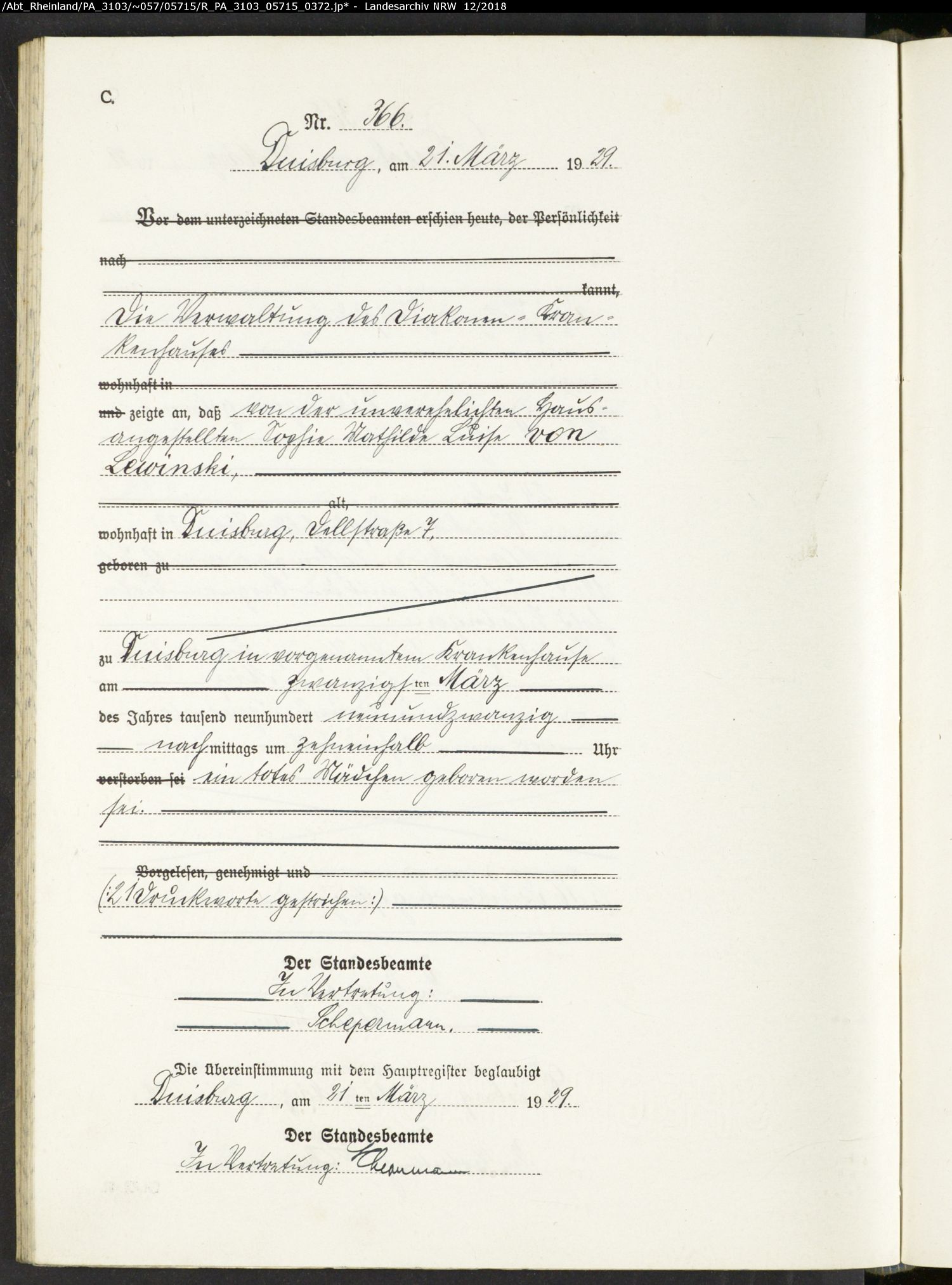 ich suche Infos zu Franziska Alexandrine Rosalie von Lewinski. Sie ist laut Düsseldorfer Geburtenregister unverehelichte Mutter von Artur von Lewinski * 9.7.1917. Die Geburt fand in der Friedenstraße 60 in Düsseldorf statt, in der Wohnung der Hebamme. Wohnsitz der Mutter war aber nicht Düsseldorf, sondern Duisburg, Dellstraße 7. Dort wohnt laut Duisburger Adressbuch ein Artur von Lewinski, Bahnsekretär. Von ihm gibt es einen Entnazifizierungs-Nachweis: