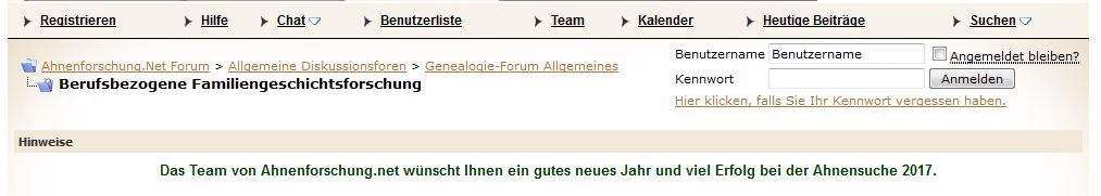 Im Unterforum "Genealogie - Forum Allgemeines" ist, wenn ich als "nicht angemeldeter User" auf der Seite bin, lediglich das Unterforum "Berufsbezogene Familienfoschung" sichtbar und auch "betretbar".