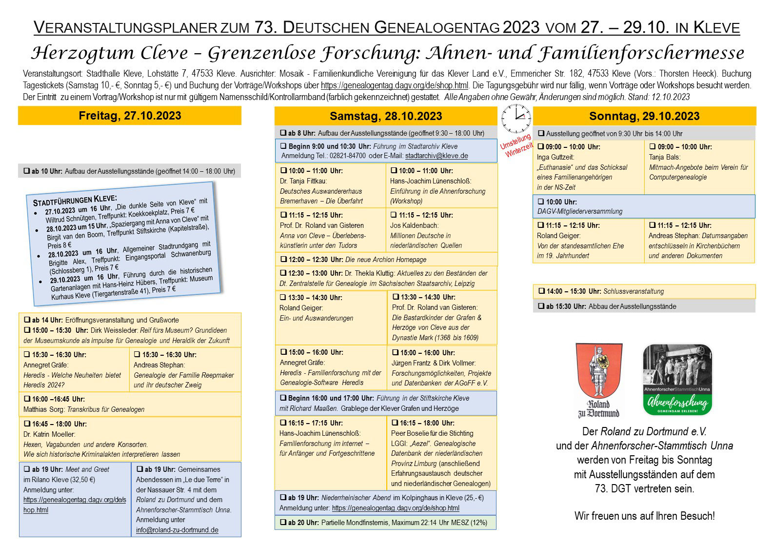 Damit die Orientierung in dem vielfältigen Veranstaltungsangebot besser gelingt, haben der Roland zu Dortmund e.V. gemeinsam mit dem Ahnenforscher-Stammtisch Unna einen kleinen „Veranstaltungsplaner“ zusammengestellt, der kostenlos auf der Homepage des Roland heruntergeladen werden kann. (Alle Angaben sind natürlich ohne Gewähr.)